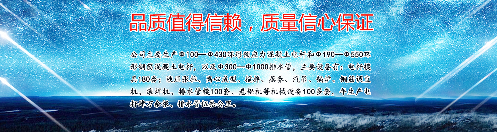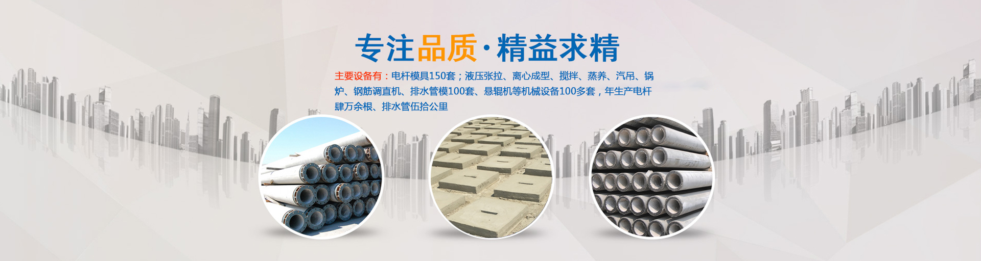 公司主要生產(chǎn)ф100—ф430環(huán)形預(yù)應(yīng)力混凝土電桿和ф190—ф550環(huán)形鋼筋混凝土電桿,以及ф300—ф1000排水管,主要設(shè)備有:電桿模具180套;液壓張拉、離心成型、攪拌、蒸養(yǎng)、汽吊、鍋爐、鋼筋調(diào)直機(jī)、滾焊機(jī)、排水管模100套、懸輥機(jī)等機(jī)械設(shè)備100多套,年生產(chǎn)電桿肆萬(wàn)余根、排水管伍拾公里?!?